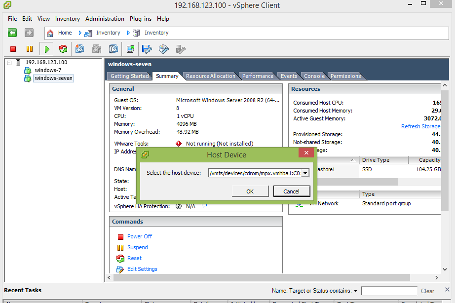 Under the hardware tab, click CD/DVD, Client Device, and Pass-through IDE (note this step might be skipped)